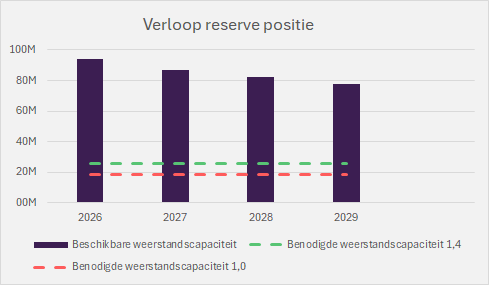 Ter illustratie: met een beschikbare weerstandscapaciteit van ongeveer €26 miljoen wordt, gezien het huidige risicoprofiel, al voldaan aan de norm van een weerstandsfactor 1,4. De onderstaande grafiek laat het verloop van onze reserves zien, naast de benodigde capaciteit bij een factor van 1,4 (€26 miljoen) en bij een factor van 1,0. Bij een weerstandsfactor 1,0 kunnen wij exact eenmaal de geïdentificeerde risico’s opvangen.