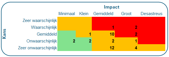 Voor het risicoprofiel zijn in totaal 39 risico’s in kaart gebracht. Vijf daarvan vallen in de rode categorie. Dit zijn risico’s waarvan de kans groter is dan 50% dat ze optreden en die duidelijke gevolgen kunnen hebben:
